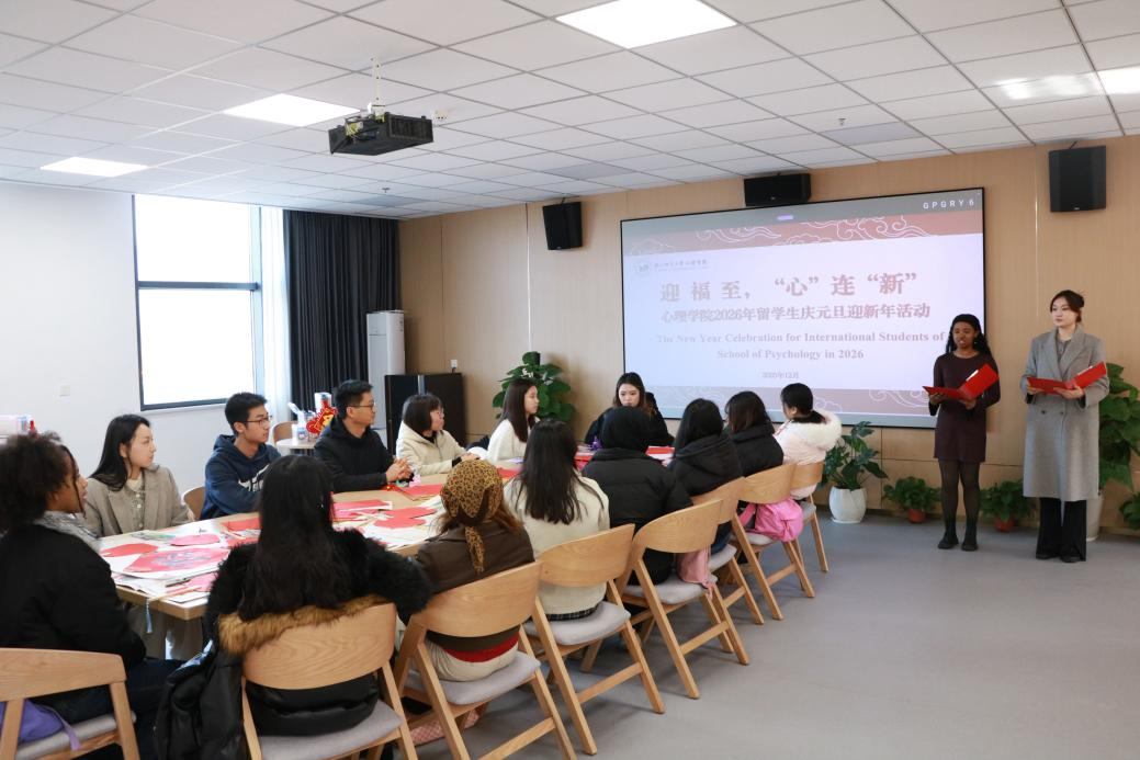 岁末迎新,福气盈门。2025年12月31日上午,浙江师范大学心理学院在33幢501会议室举办了“迎福至,‘心’连‘新’”——2026年留学生庆元旦迎新年活动。心理学院院长孙炳海、教务办主任施丽君与来自世界各地的心理学院留学生们欢聚一堂,共同迎接新年的到来。
