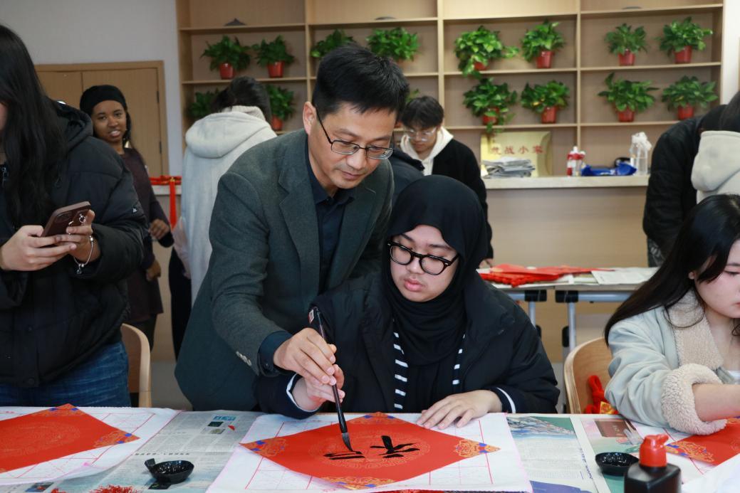 随后,活动进入“写福字”体验环节。在书法老师的指导下,留学生们亲手执笔、铺纸研墨,一笔一画书写属于自己的“福”字。孙炳海院长亲笔示范,带领大家感受汉字书法中蕴含的和谐与祝福。红纸墨香间,一个个“福”字跃然纸上,不仅传递着对新年的美好期盼,也成为跨越文化的心灵纽带。