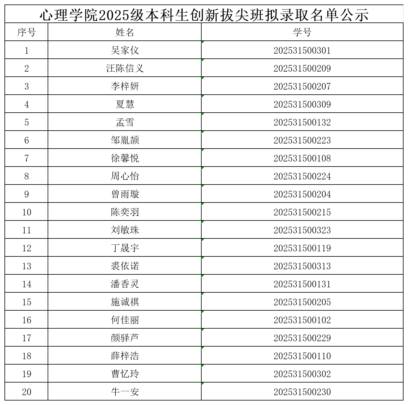 经学生自主申请,学院组织专家进行评审,现将2025级本科生创新拔尖班学员拟录取名单公示如下,如有异议,请于2026年3月26日前向学院教务办反馈(电话:82281372)。